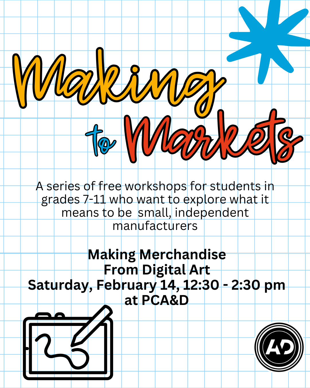 Through interactive workshops led by creative professionals and emerging artists/designers, students will gain practical experience with marketing, branding, and packaging. Students will leave each workshop with the essential skills for standing out in a competitive marketplace. They will learn how to present their work, connect with customers, and tell the story behind what they make. Each attendee will also have the opportunity to apply to become a vendor at the PCA&D’s Spring Student Art Market in April, offering a real-world chance to showcase and sell their work. Making to Markets empowers young creators to see themselves not just as artists or designers, but as confident, independent makers ready to bring their ideas to the market! Spaces are limited, register today!